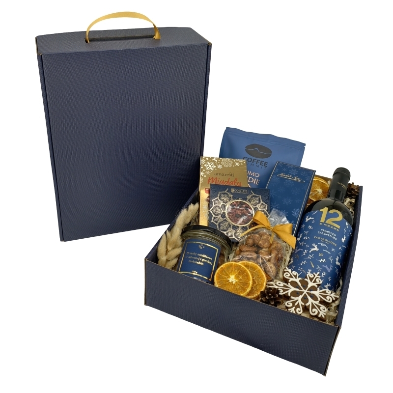 Biała Symfonia to bogaty zestaw upominkowy, który łączy włoskie wino w limitowanej edycji, egzotyczną kawę z Indii oraz wyrafinowane czekolady i pierniki. Idealny dla osób ceniących harmonijne kompozycje smaków, elegancję i symfonię zimowych wrażeń.