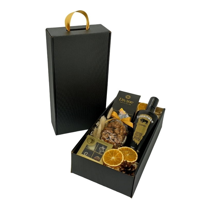 Leśny Szept to wyjątkowy zestaw upominkowy, który łączy legendarną polską wódkę Żubrówka Czarna, ekskluzywne praliny oraz naturalne dekoracje. Idealny dla osób ceniących polskie tradycje, leśne aromaty i wyjątkowy charakter premiumowych alkoholi.