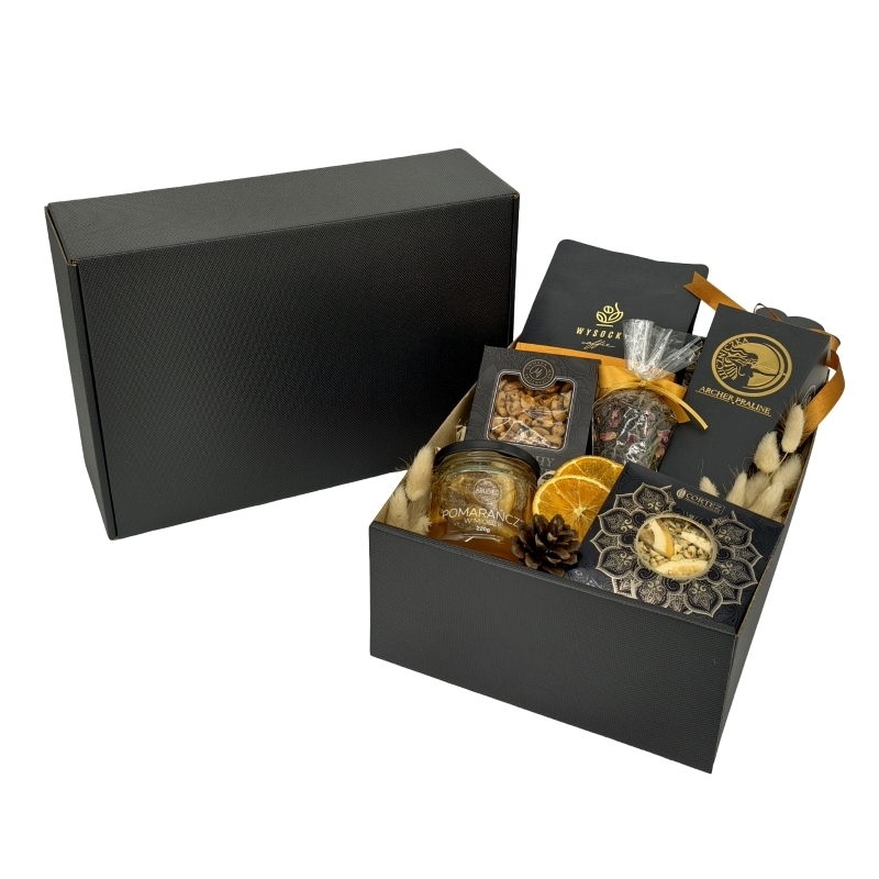 Szafirowy Blask to starannie skomponowany zestaw upominkowy, który zachwyca połączeniem cytrusowych akcentów, aromatycznej kawy oraz luksusowych pralin. Idealny dla koneserów ceniących jakość, elegancję i harmonię smaków.