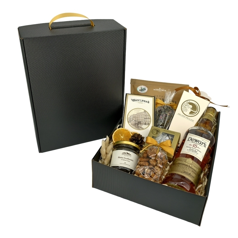 Zimowa Melodia to prestiżowy zestaw upominkowy, który łączy 15-letnią szkocką whisky Dewar's, unikatową kawę z Nepalu oraz luksusowe praliny. Idealny dla koneserów ceniących szlachetne alkohole, egzotyczne smaki i wyrafinowaną elegancję.
